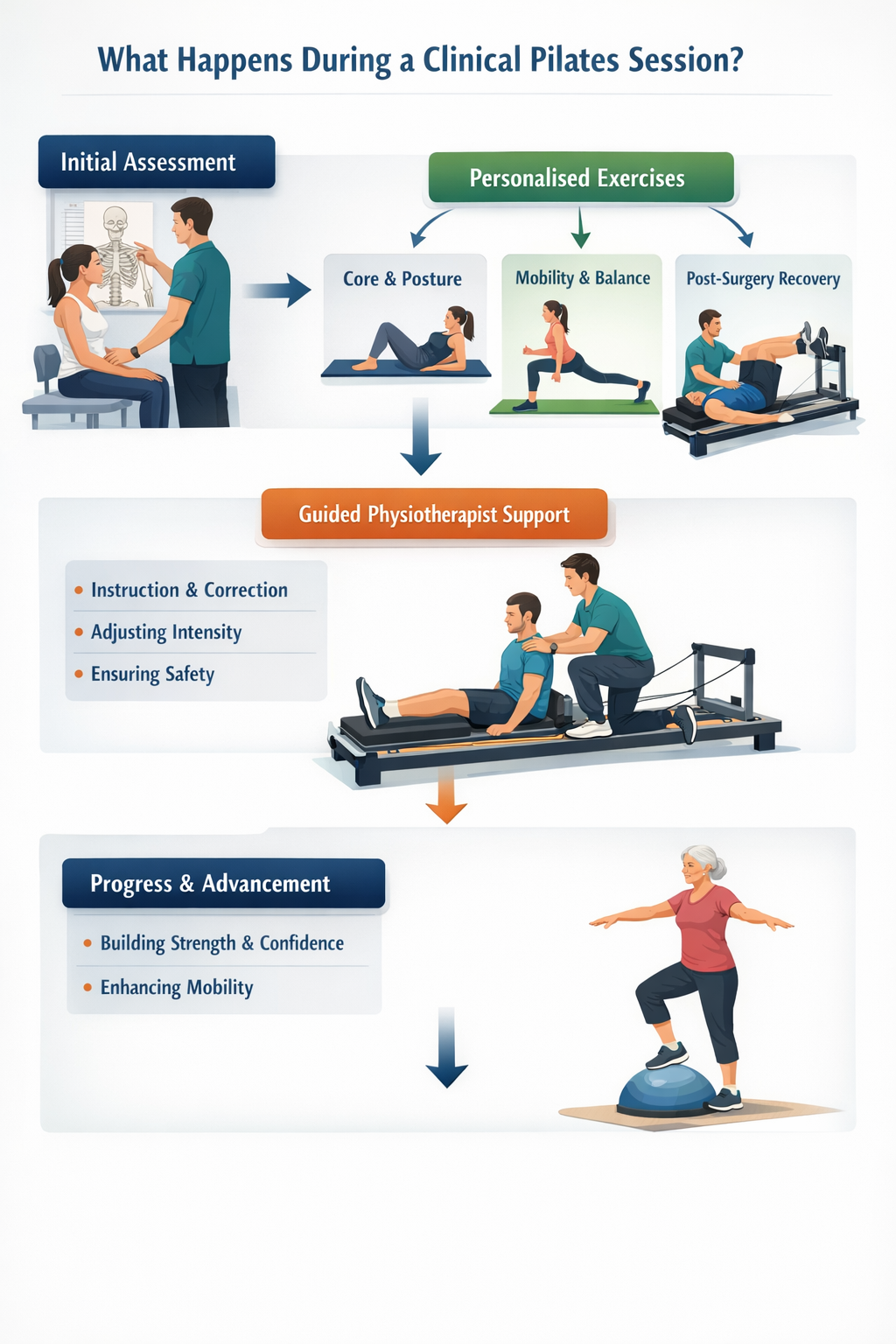 Clinical Pilates is a rehabilitation-focused form of Pilates that is guided by a physiotherapist. It uses controlled exercises to improve strength, coordination, posture, and body awareness. The aim is not just to complete movements, but to perform them with better alignment, control, and understanding.